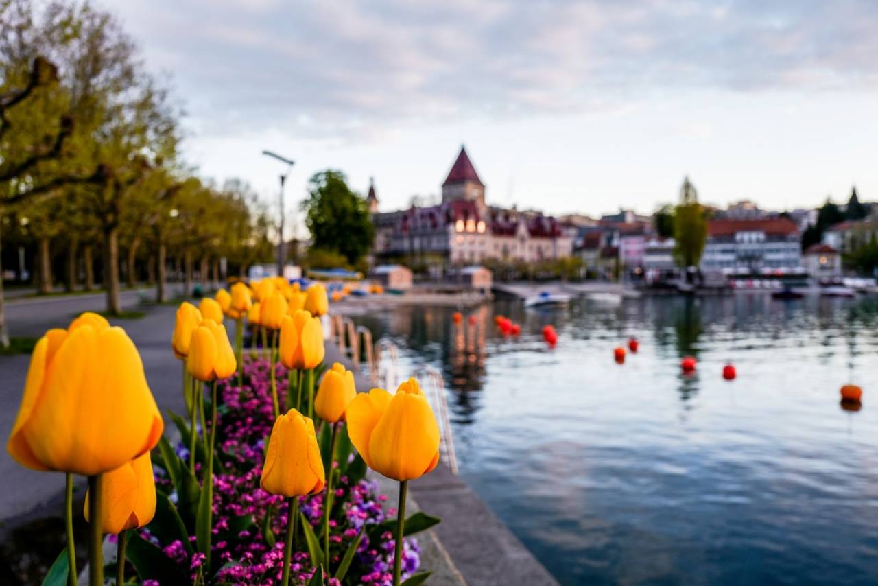 4月~5月には、13世紀にサヴォイア家が築いたモルジュ城の裏手にあるアンデパンダンス公園で、チューリップ・フェスティバルが開かれ、約300種類、12万本ものチューリップが街をカラフルに彩ります♪レマン湖とフレンチアルプスをのぞむ絶好のロケーションで咲き誇る花々を見るために、世界中から観光客が訪れます。