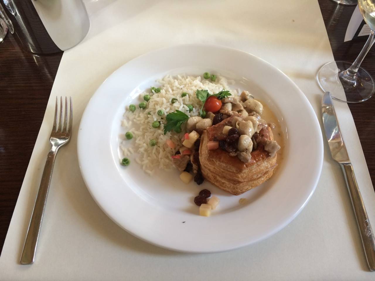 サクサクのパイ生地にナイフを入れると熱々のクリームソースがじゅわ~っと溢れます。パイの中に入っているのは、お肉のボール。(牛肉のつくねみたいな感じです。多くは豚肉も入っています。)小さなソーセージをイメージしていただいてもいいかもしれません。付け合わせはお米やパスタ、フライドポテト、人参やインゲン豆などの温野菜など。マッシュルームの濃厚なホワイトソースがちょっとスパイシーなお肉と絡まって美味しいです。