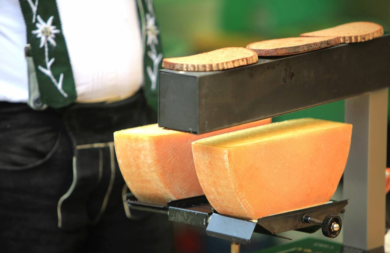 チーズの断面を直火で温め、トロっと溶けたところをナイフで削いでジャガイモなどに絡めて食べるスイスの郷土料理。
