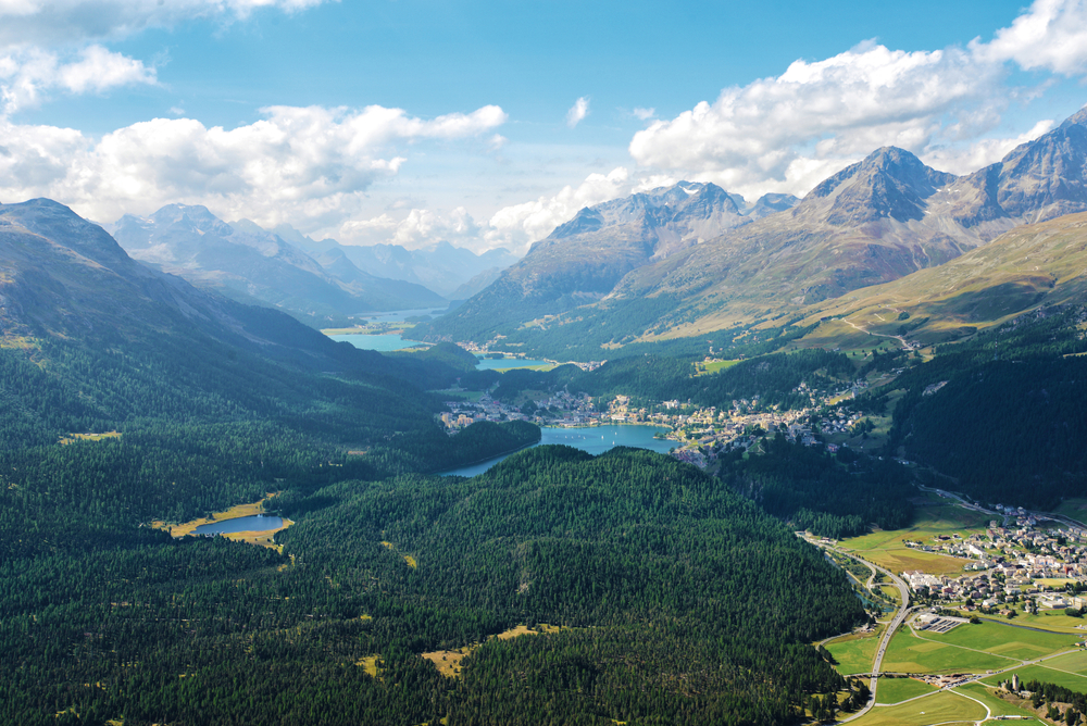 鉄道の旅スタート! 鉄道パスを利用して、穏やかなアルプスの景観豊かなエンガディン地方サンモリッツへ *鉄道所要時間: 約3時間半 / 1回乗換え 午後: サンモリッツ散策 ホテルチェックイン |